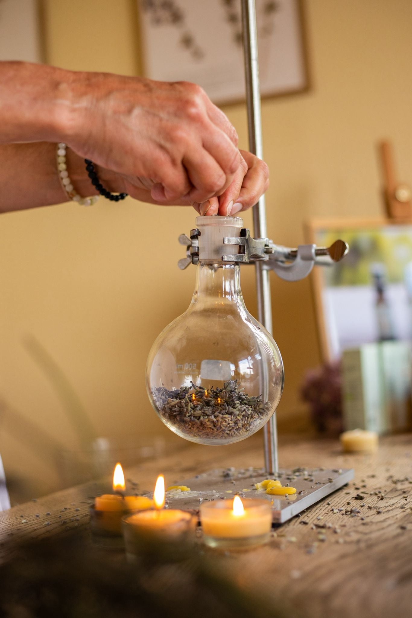 Aus selbstgemachten Hydrolaten und ätherischen Ölen entstehen im Laufe des Tages pflegende Produkte wie Lotionen, Cremes und natürliche Aromasprays – frisch hergestellt, achtsam verarbeitet und direkt erlebbar auf der Haut.